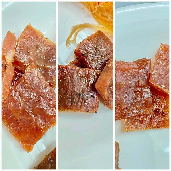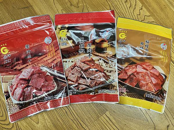 這三種肉乾是F貓最喜歡的口味,以前每團必買~五、六年沒吃,口味依舊不變;蜜汁肉乾軟嫩多汁香甜,黑胡椒厚實口感有嚼勁~還帶著胡椒香;檸檬肉乾較薄、口感偏乾,但一股檸檬香完美的融合豬肉的味道,吃起來不膩口非常涮嘴~