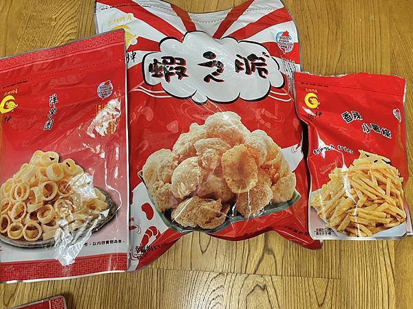 這三樣非油炸的烘烤餅乾式的小零嘴,味道都不重~洋芋圈幾乎沒什麼特別的味道,就是鹹鹹脆脆的餅乾而已;蝦之脆倒還有些蝦餅的香味~香辣小薯條就有點微辣了,別買給怕辣的小小孩吃喔~