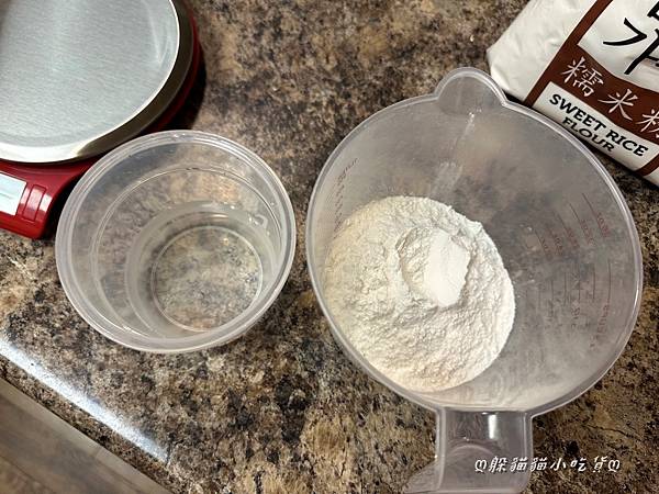 糥米粉與水比例大約10:6,依各家糯米粉品質不同有所增減,原則就是「太黏加粉、太乾加水」,邊揉麵糰邊調整到最適合的黏度囉!這次使用韓國糯米粉很容易吸水,在揉製過程中另外又多加了些水,麵糰黏稠度才調到剛好。