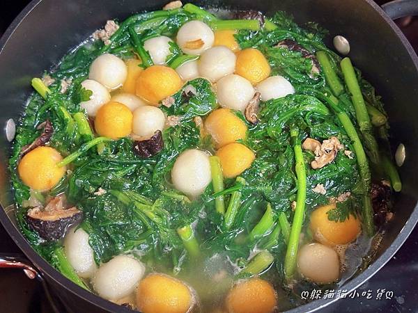 乾香菇、蒜末、蝦米、扁魚、肉末爆香炒過,加水煮滾再放入茼蒿後用鹽、味精、烹大師、薄鹽醬酒、油蔥酥調味,煮成鹹湯圓也超好吃~