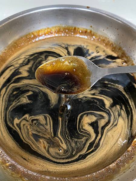 4)水與黑糖混合,小火邊攪拌邊熬煮至滾,確認黑糖完全融化即可,不需煮至黏稠(放涼後會再變黏稠一些)